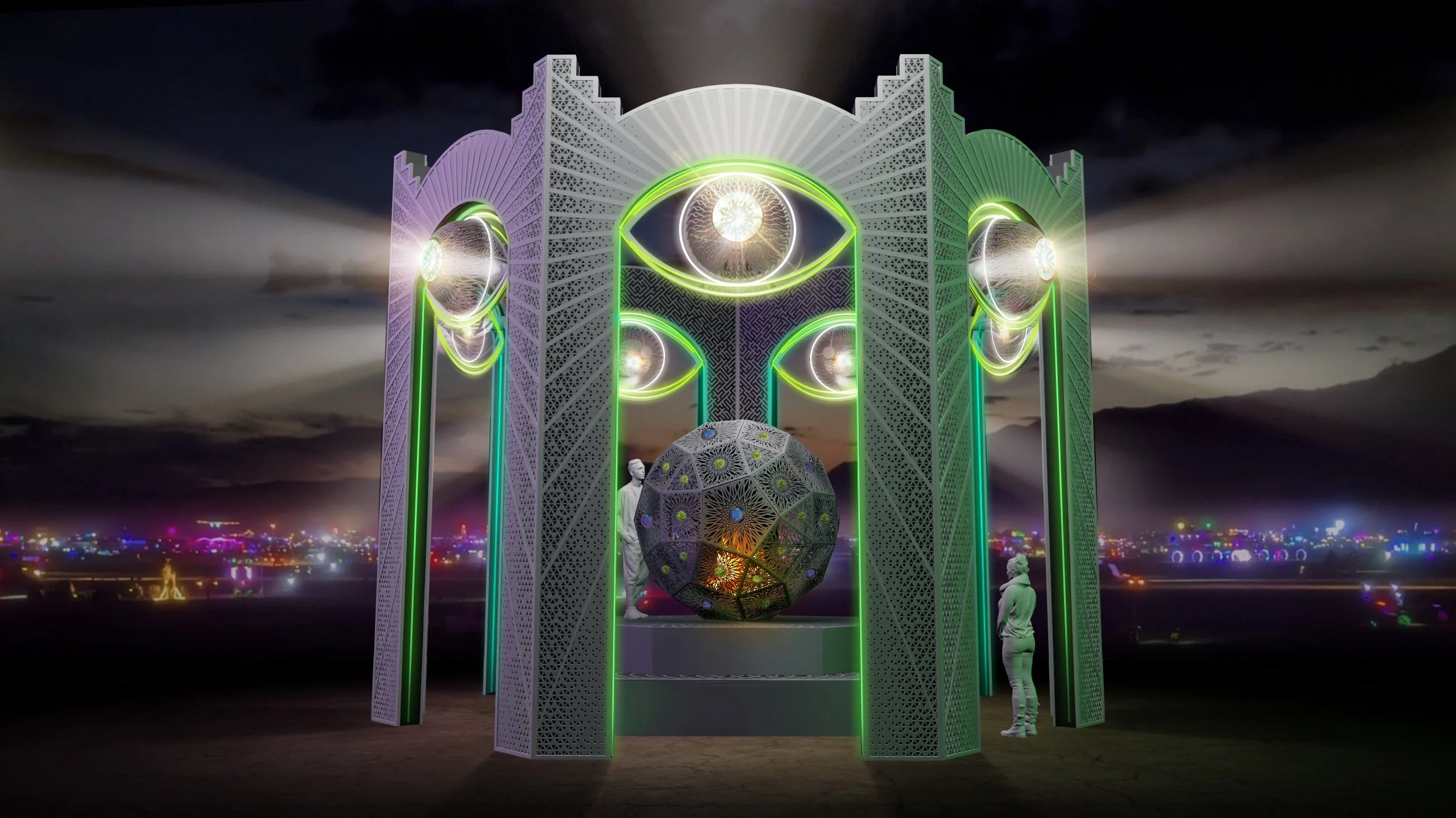 An installation concept for Burning Man 2026. The sculpture is an exploration of Aldous Huxley’s 1954 book “The Doors of Perception”. The main structure is a huge steel tower with 7 tall doorways. Participants are able to interact with the doorways and trigger unique sound effects and choreographed lighting. Voice recordings of passages from the book with mind-bending 360 sound design will echo inside the tower walls. Above each doorway are huge steel eyes that look out into the open playa. Each doorway will be themed to key topics of the book and will weave-in various introspective psychedelic topics, which were inspired by Aldous’s famous mescaline trip back in the early 1950’s.